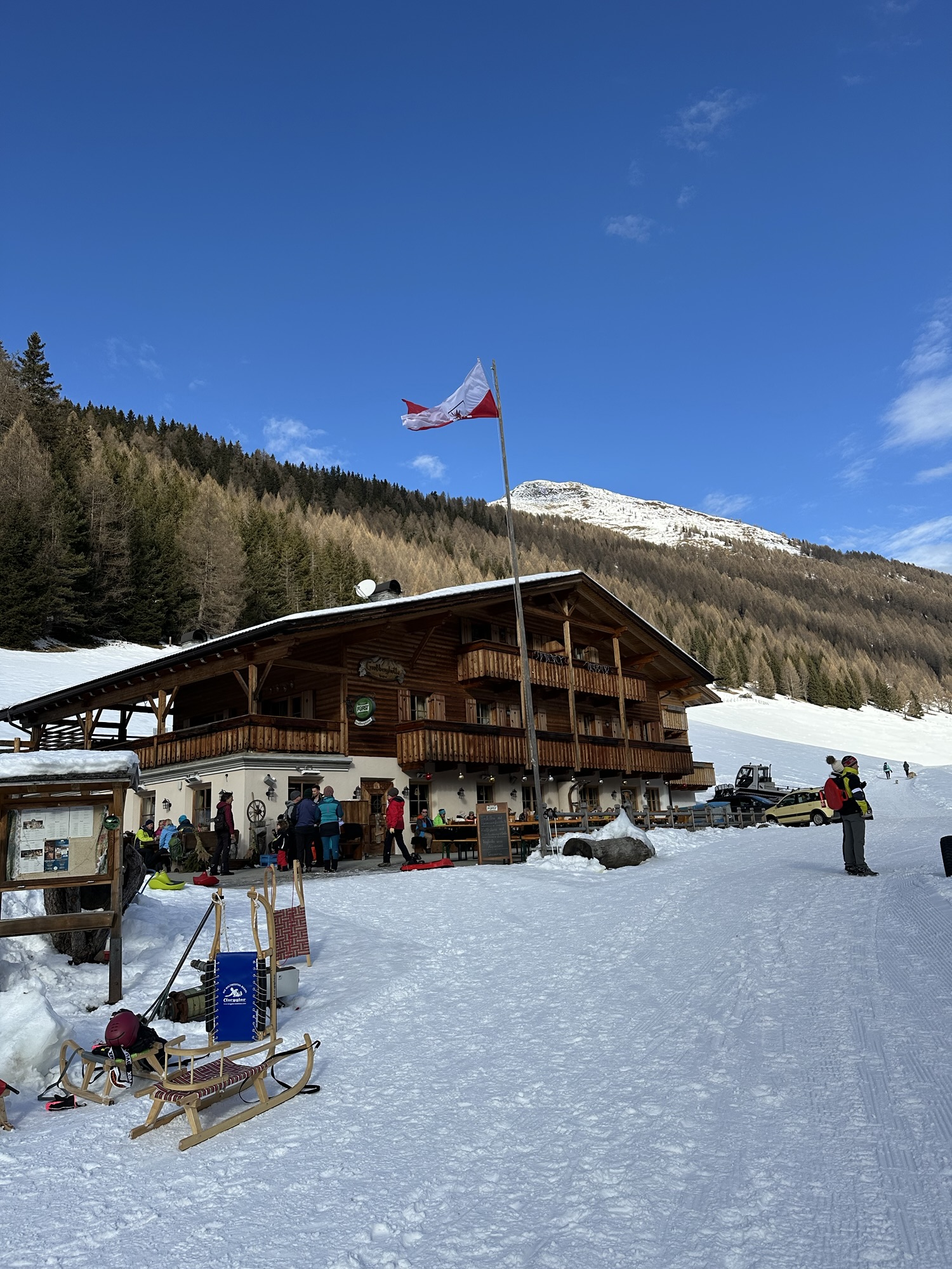 Dopo circa un’ora di cammino, si raggiunge il Rifugio Großberghütte, un’accogliente baita di montagna perfetta per una sosta ristoratrice. Qui è possibile assaporare piatti tipici altoatesini come canederli, speck, strudel di mele e una deliziosa cioccolata calda, perfetta per scaldarsi dopo la camminata nella neve.